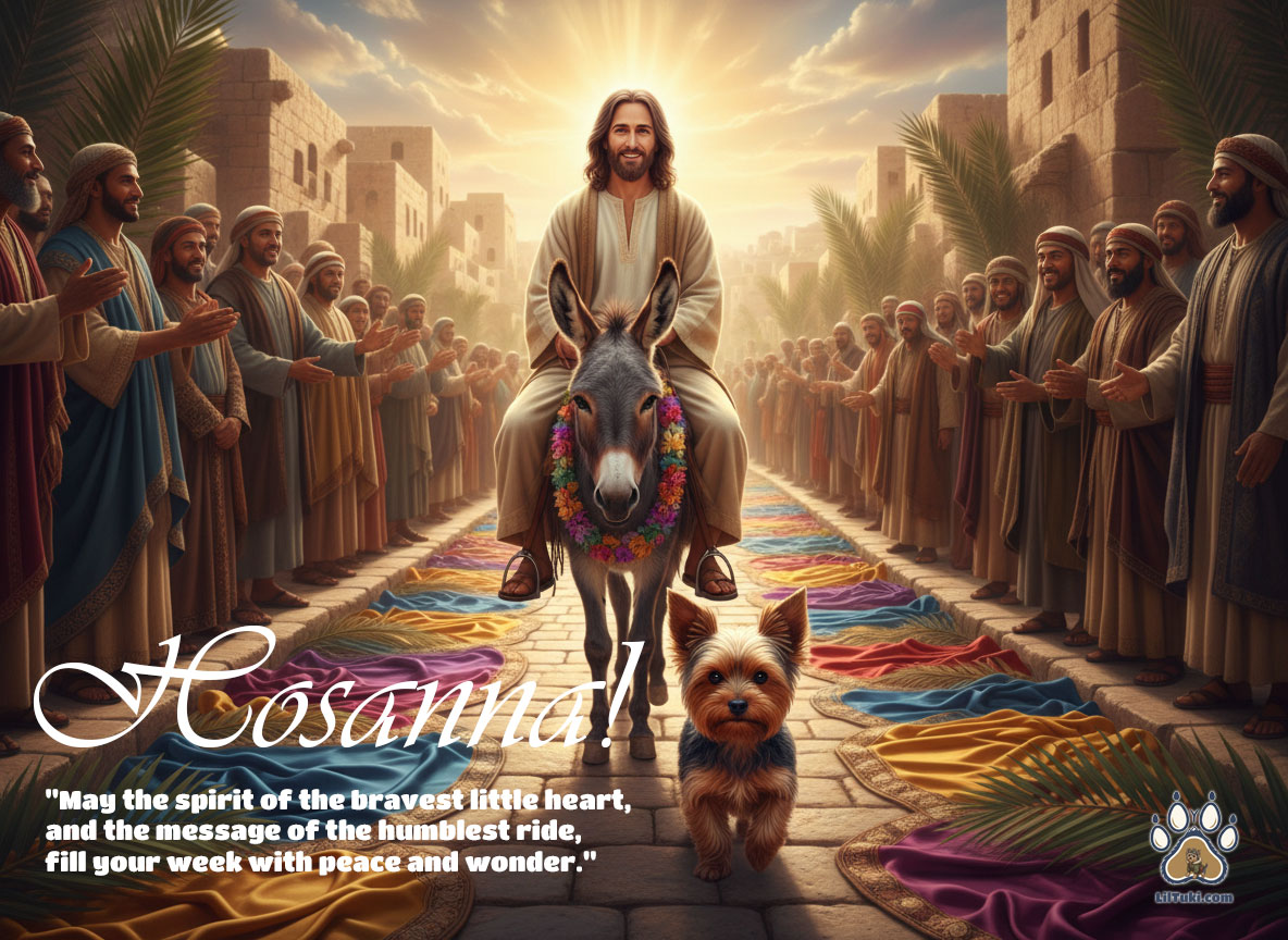 Tuki’s tail didn’t just wag; it vibrated. His little heart nearly leaped out of his chest. Jesus chose Donkey? His humble, steady friend was to be the mount for the King? Tuki let out a soft, melodic version of his rumble—not a warning this time, but a purr of absolute pride.